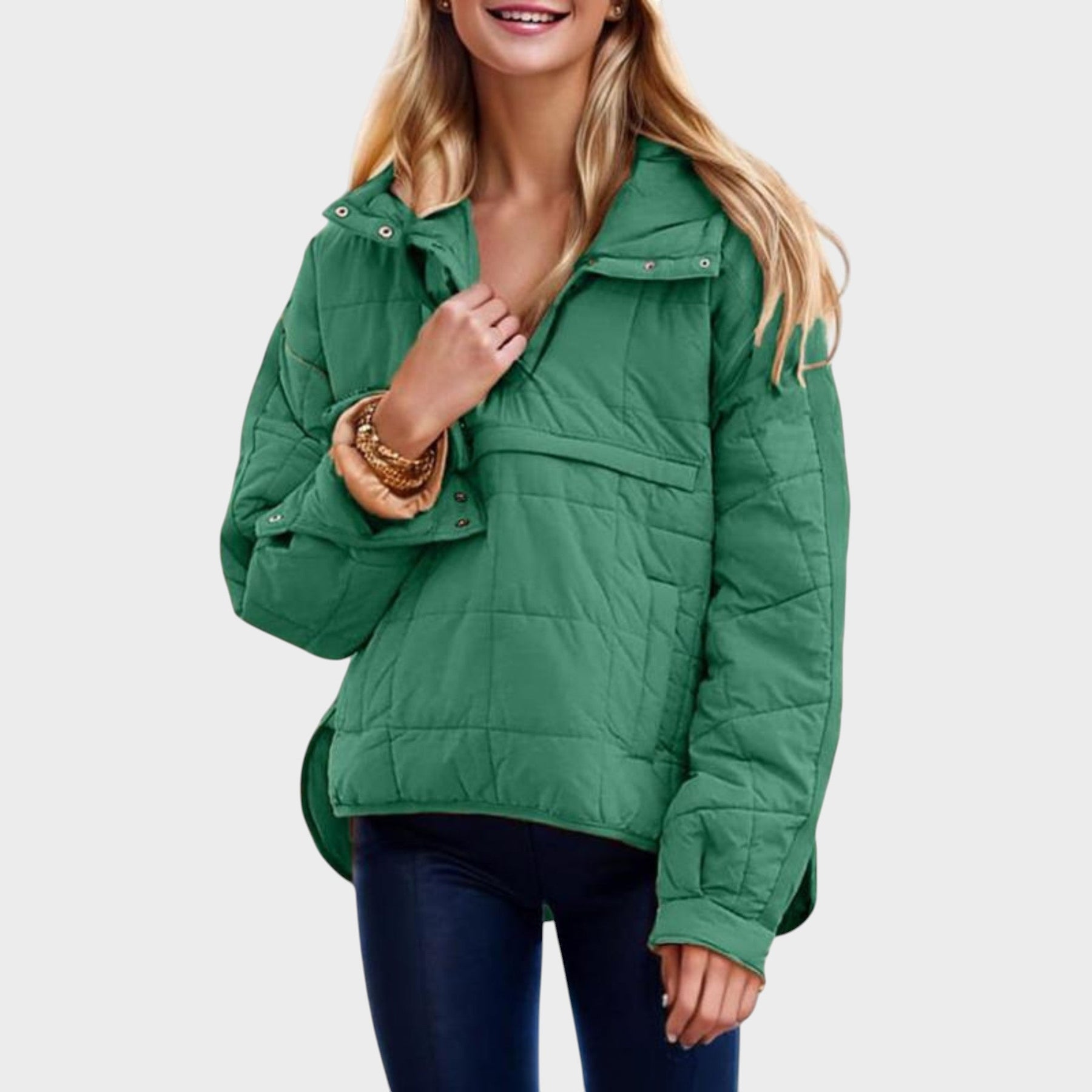 Elisa™ é a peça ideal para dias frios, unindo praticidade e elegância. O design acolchoado proporciona isolamento leve e confortável, enquanto o capuz e o corte moderno garantem um visual casual e sofisticado ao mesmo tempo.